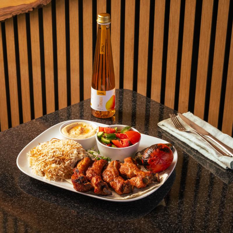 All plates include rice or potatoes, Armenian summer salad, hummus, grilled vegetables, and lavash.