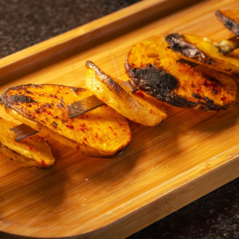 Grilled potato slices seasoned with Mediterranean spices, skewered, and served on a bed of fresh lettuce.