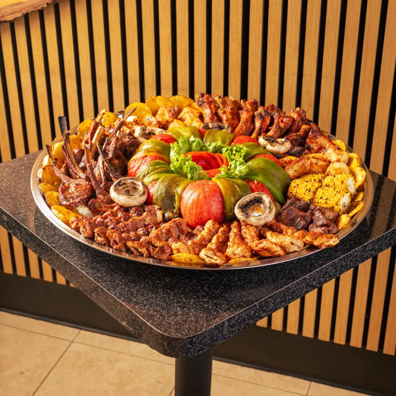 Sam's special family platter, presented in a beautiful round tray, features a delectable assortment of meats, potatoes, grilled vegetables, and rice.